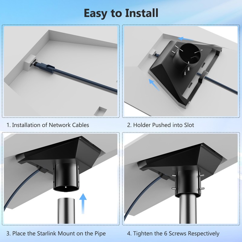 - Easy Installation: Starlink Gen 3 pipe adapter comes with necessary installation accessories, easy to install even without professional skills. Specially designed for Starlink III, just insert the Gen3 bracket into the antenna slot, then mount the pole to the pipe adapter and tighten the screws.