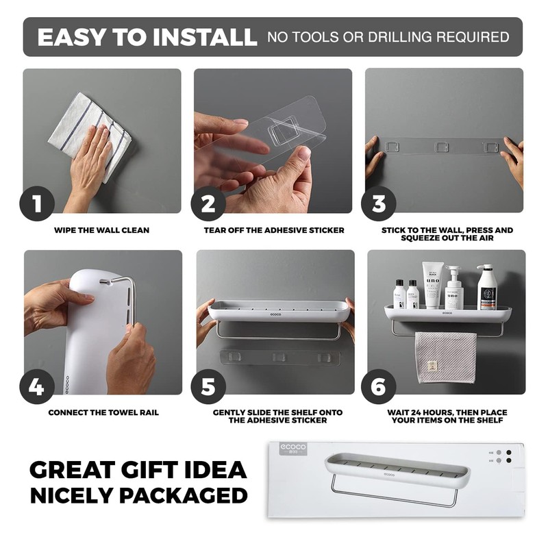 EASY TO INSTALL: No tools or drilling required. Simply wipe the mounting surface to ensure it is clean and dry. Apply the super adhesive strip firmly to the wall, ensuring no air is trapped under the strip. Wait 24 hours and then mount the holder onto the adhesive strip.