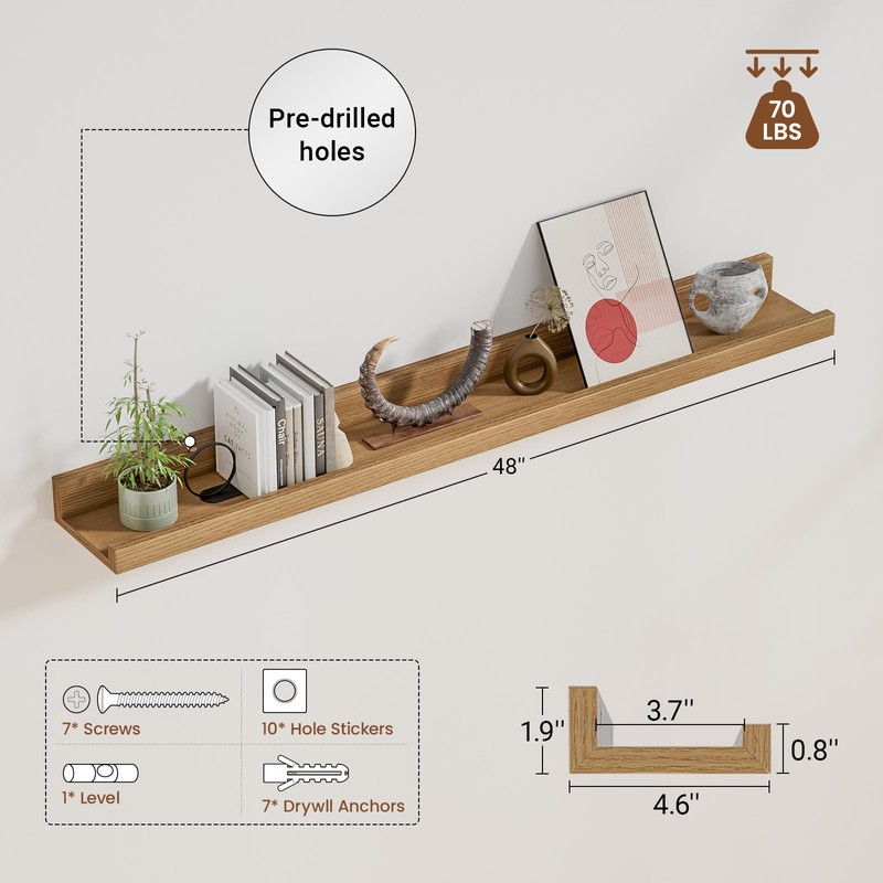 • 【Photo Ledge Shelf Dimensions】 48 inches length shelves for room wall will provide enough space to storage lots of photos, collectibles, decorative items, cosmetics, books, artwork ornaments, small green plants, kitchen spices.Also display some big item as wedding picture frame,vinyl record,You can connect 2 of floating shelf in a line to be 96 Inches length if want more.