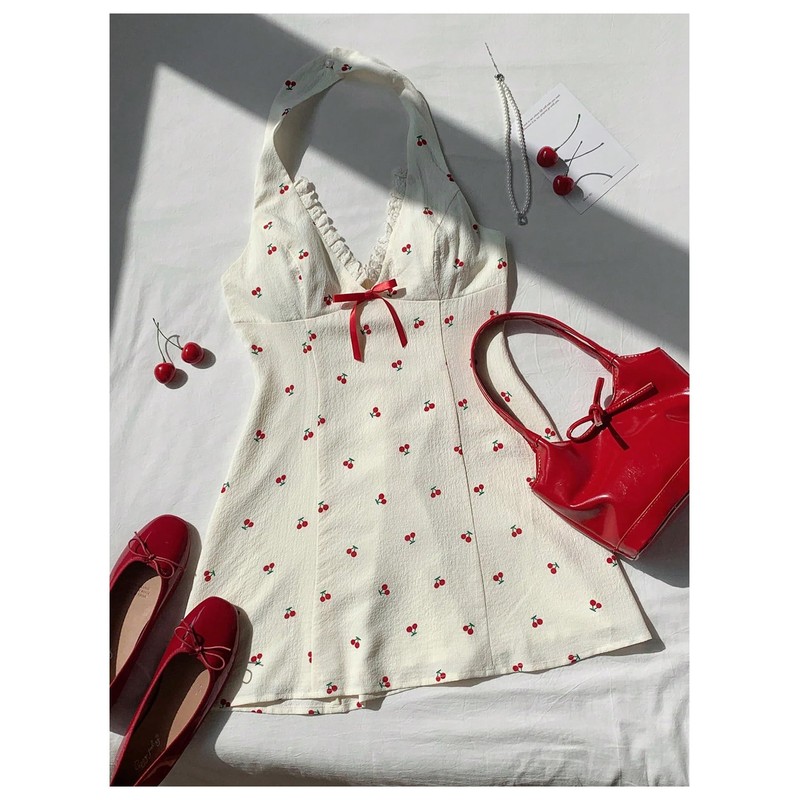 - Feature: Cherry print, bow, backless, sleeveless, flared, frill, mini, halter neck dress for women, girly dress for women