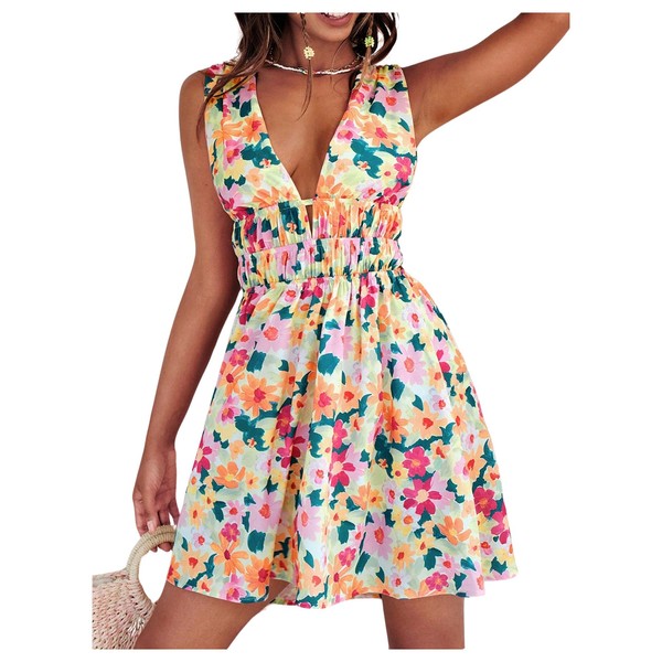 - Feature: Floral print, sleeveless, deep v back, cut out back, shirred detail, boho flared a line dress