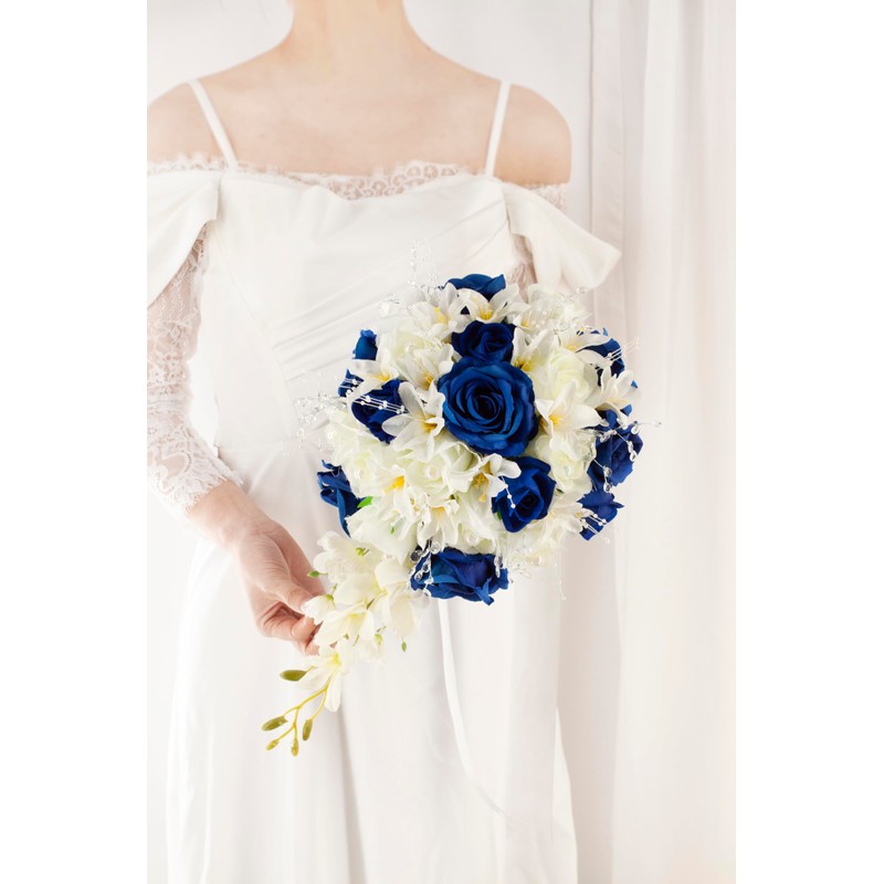 Floinla Bridal Bouquet Cascading, Royal Blue & Ivory Wedding Bouquets for Bride Bridesmaid 10" Artificial Flowers Bouquet for Wedding Decor