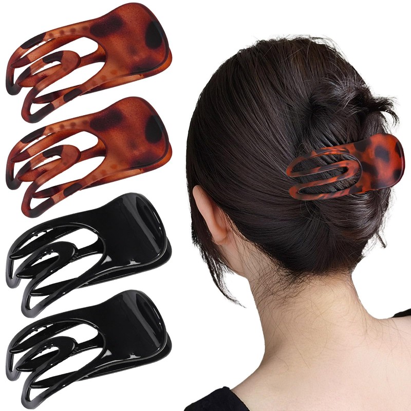 Flomiara 4PCS Flat Claw Clip, Concave Hair Clips for Thick Thin & Fine Hair Women Girls, Non-Slip Strong Hold French Claws Accessories, 2PCS Glossy Black, 2PCS Frosted Amber Set