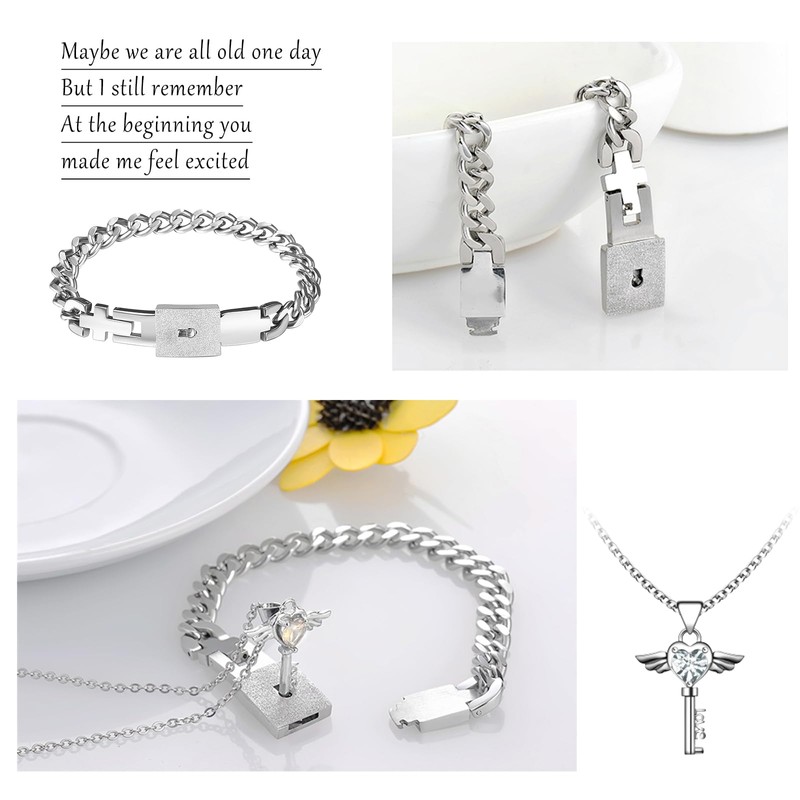 Flongo Couple Lock Key Jewellery Set: Silver Couples Bracelet Necklace Set Women's Necklace with Heart Wings Gold Cubic Zirconia Men's Cuban Lock Bracelet Stainless Steel Gift Partner Christmas