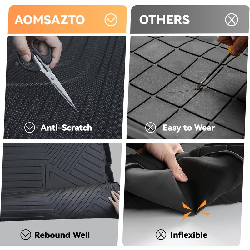 Protect your vehicle’s floor and cargo area with custom-fit floor liners & cargo mat, designed for durability, easy cleaning, and a perfect fit. Made from TPE material, AOMSAZTO floor liners and trunk mat offer resistance against spills, dirt, mud, and wear, keeping your SUV trunk cargo space or rear seat back pristine.