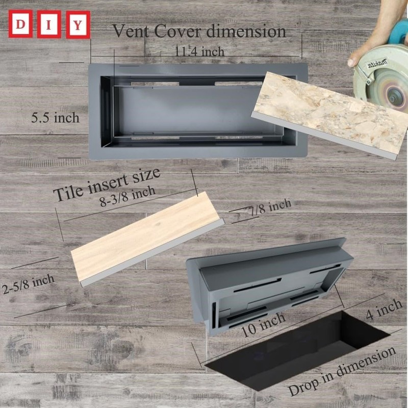 Floor Register 4x10 Tiles Vent Covers Vents registers 4 X 10 Tile Insert Cover Steel 10x4 Drop in with Custom Made Tiles Inserts Tray Low Profile Hardwood Floors grates Grille Marble Flooring (Gray)