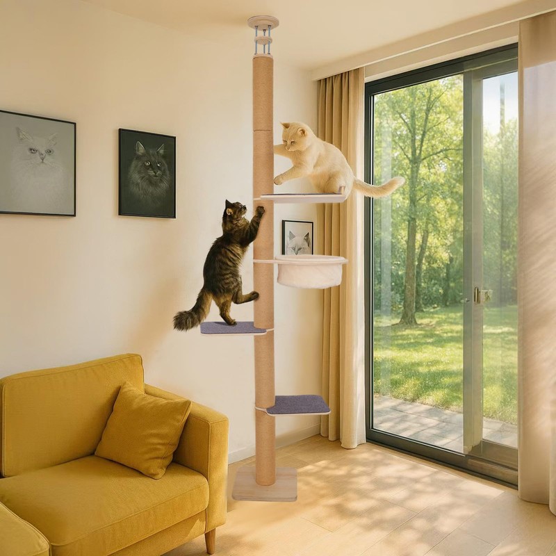 • 🐱【Cozy Cat Hammock & Activity Center】 With a built-in cat hammock, springboard, and lookout perch, this floor-to-ceiling cat tree creates a multi-level playground for climbing, scratching, and napping. The spacious platforms and perch let cats observe their surroundings, while the soft hammock provides a comfortable relaxation space.