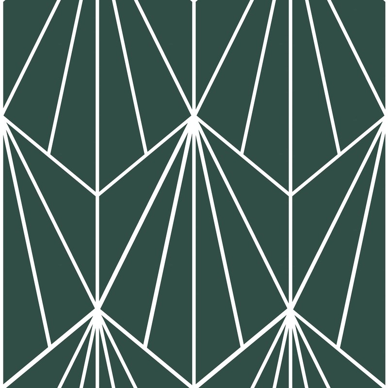 - Emerald green geometric peel and stick floor tiles with a mid-century modern style