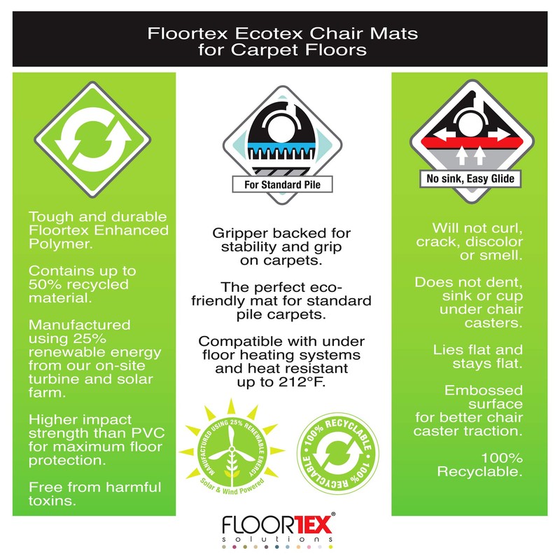 - Environmentally friendly chair mat made with recycled enhanced polymer (up to 50%).