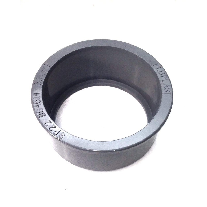 FLOPLAST boss adaptor - solvent 50mm (Actual Pipe Size is 56mm) in grey. IMPORTANT NOTE: Solvent Weld Waste Pipe fitting sizes are often stated in metric standard measurements, however the actual pipe size is measured in imperial. The three options are as follows - 32mm Solvent Weld Pipe actually measure 1 1/4 inchs or 36mm, 40mm Solvent Weld Pipe actually measure 1 1/2 inchs or 43mm, 50mm Solvent Weld pipe actually measure 2 inchs or 56mm. In addition if the term "ABS" is printed on the pipe this identifies the pipe as solvent weld waste pipe.