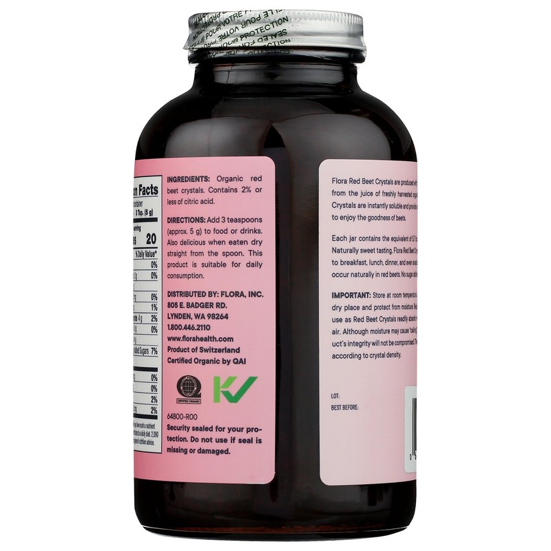 Flora Red Beet Crystals are produced with the utmost care. Pressed from the juice of freshly harvested organic beets, Flora Red Beet Crystals are instantly soluble and provide an easy and delicious way to enjoy the goodness of beets. Each jar contains the equivalent of 5.7 lbs. of fresh, organic beets. Naturally sweet tasting, Flora Red Beet Crystals can easily be added to breakfast, lunch, dinner, and even snacks! 4 g sugar (per serving) occur naturally in red beets. No sugar added from other sources.