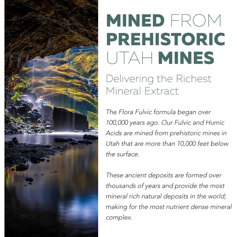 - MINED FROM PREHISTORIC DEEP-EARTH DEPOSITS | The Flora Fulvic formula began over 100,000 years ago. Our Fulvic and Humic Acids are mined from prehistoric mines in Utah that are more than 10,000 feet below the surface. These ancient deposits are formed over thousands of years and provide the most mineral rich natural deposits in the world; making for the most nutrient dense mineral complex.