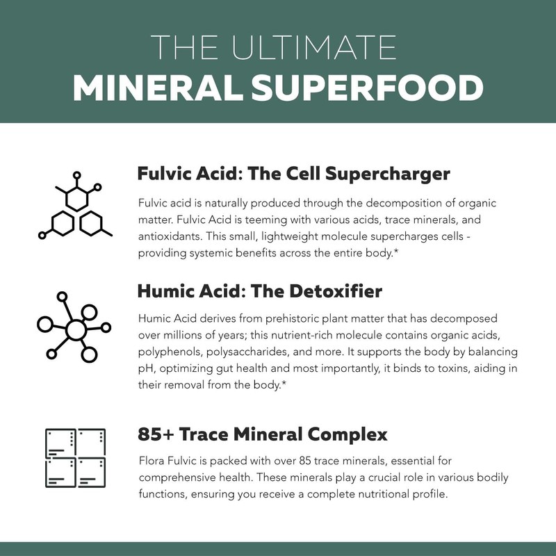 - FULVIC ACID + HUMIC ACID TRACE MINERAL COMPLEX | Flora Fulvic is a powerhouse superfood blend of the purest and most potent Fulvic Acid, Humic Acid and naturally occurring Trace Mineral complex.