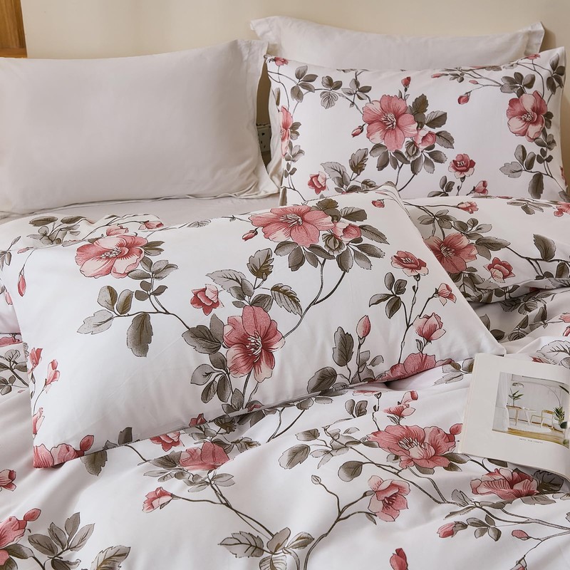 Floral Bedding King 100% Cotton Duvet Cover Set Botanical Comforter Cover Cute Garden Pink Flower Breathable Lightweight 3 Pcs