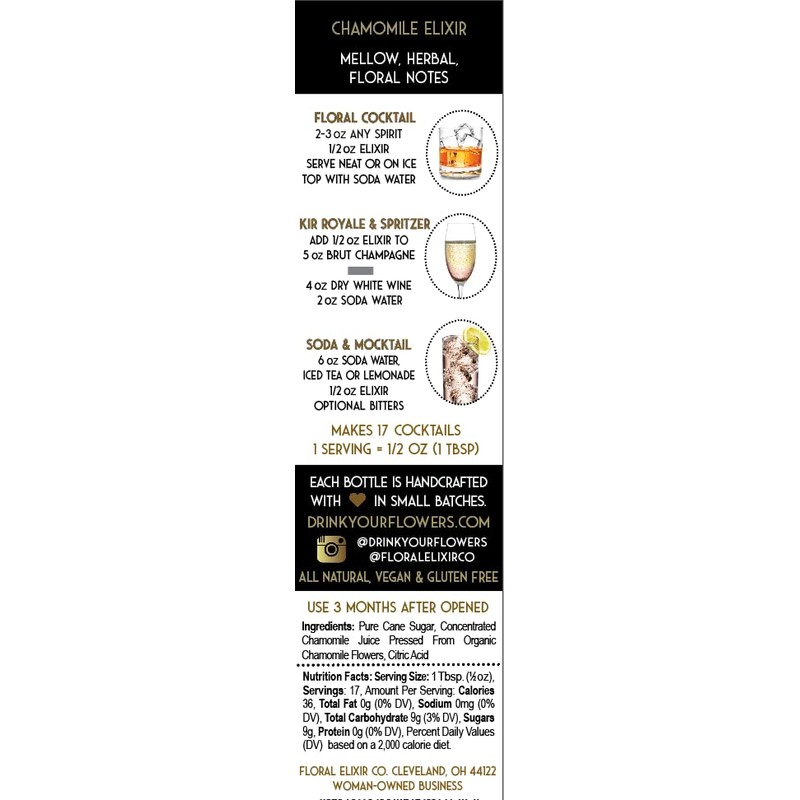 • ELEVATE your drink - Add our Chamomile Elixir to your favorite spirits for a floral twist on cocktails. Create sodas and non-alcoholic cocktails with still or sparkling waters, teas and lemonade.