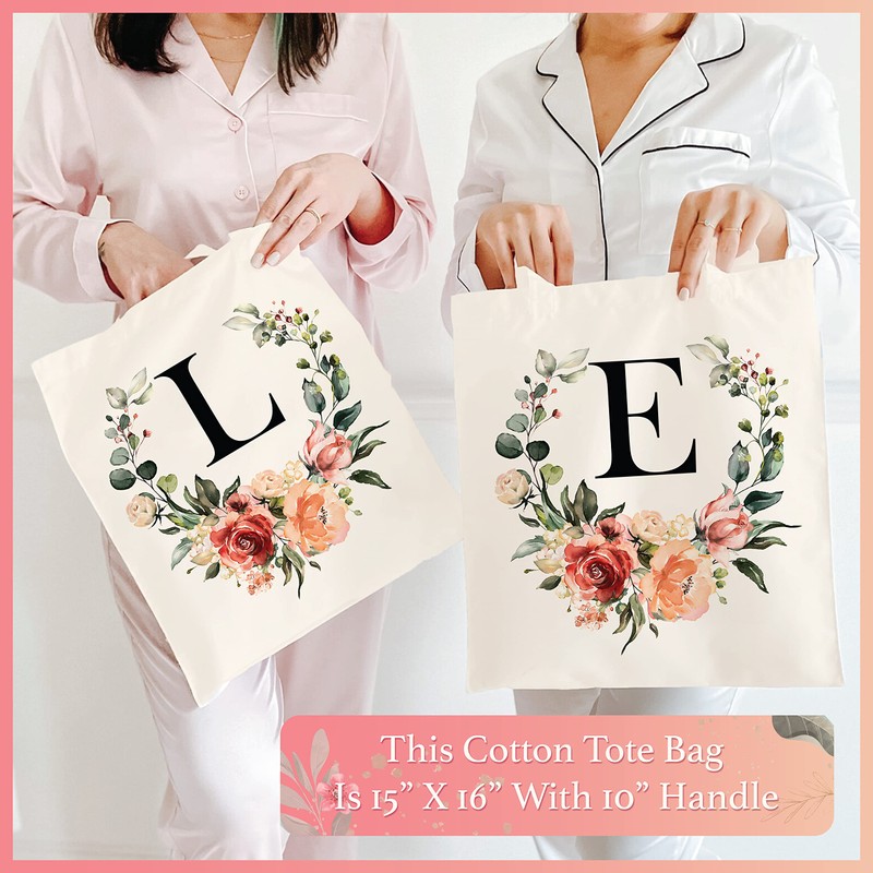 - UNIQUE FLORAL DESIGN: We know all women love flowers. Our company' target is to create a cute design for every women while we are establishing this cute floral-initial tote bag. Especially, floral wreath design created for bride & bridesmaid. You can give the this initial tote bag on hen party gift. Also, women can use the this floral initial tote bag in daily use. All floral details are created with care by professional designer team and printed with professional printing methods.