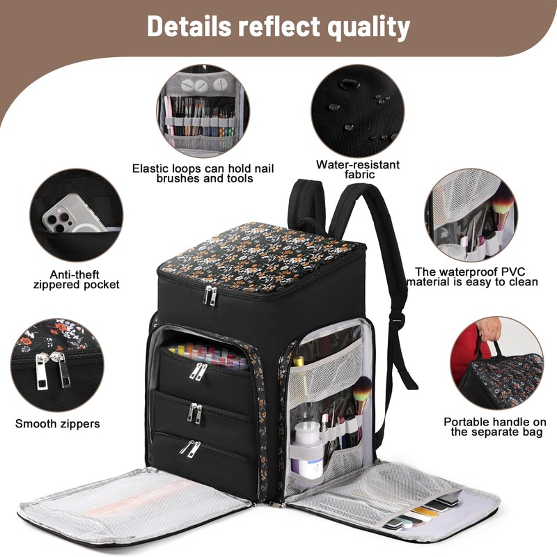 - SPACIOUS DESIGN: Large-capacity nail polish storage backpack with multiple compartments and a floral pattern design for organizing nail polishes and accessories