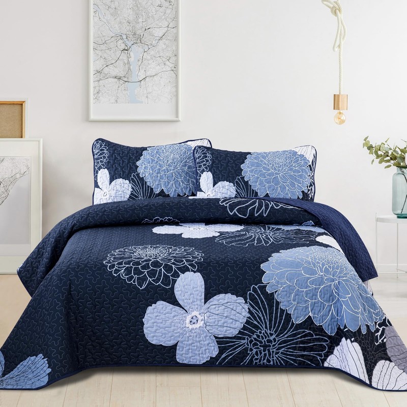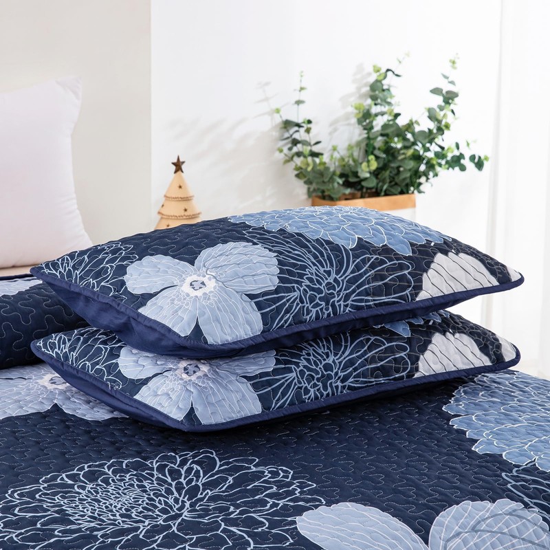 Floral Quilt Set California King Size Navy Blue Boho Bedspread 3 Pieces Soft Lightweight Coverlet with 2 Pillow Shams for All Season 106"x96"