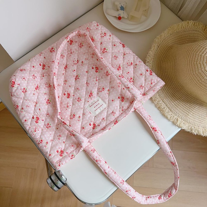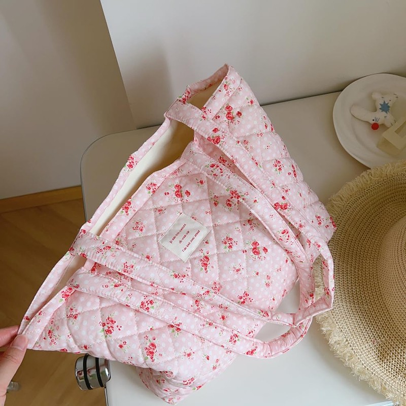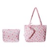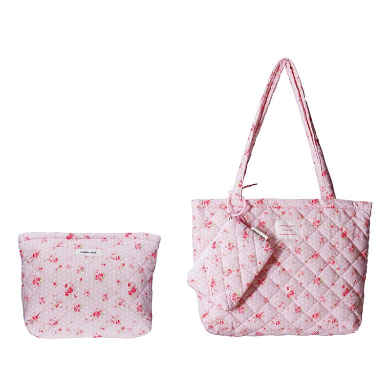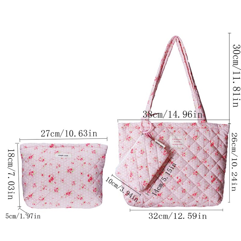 Floral Quilted Cotton Shoulder Bag Set 3-in-1 Handbag with Matching Mini Pouch Cosmetic Bag Large Capacity Tote A053 (Pink)