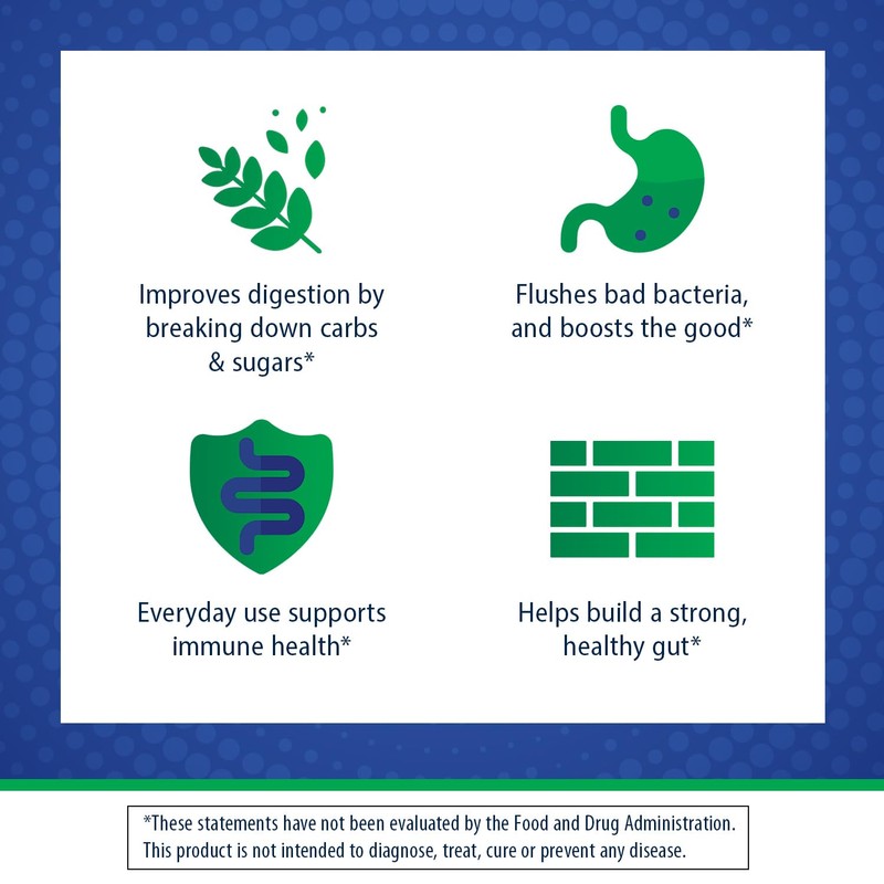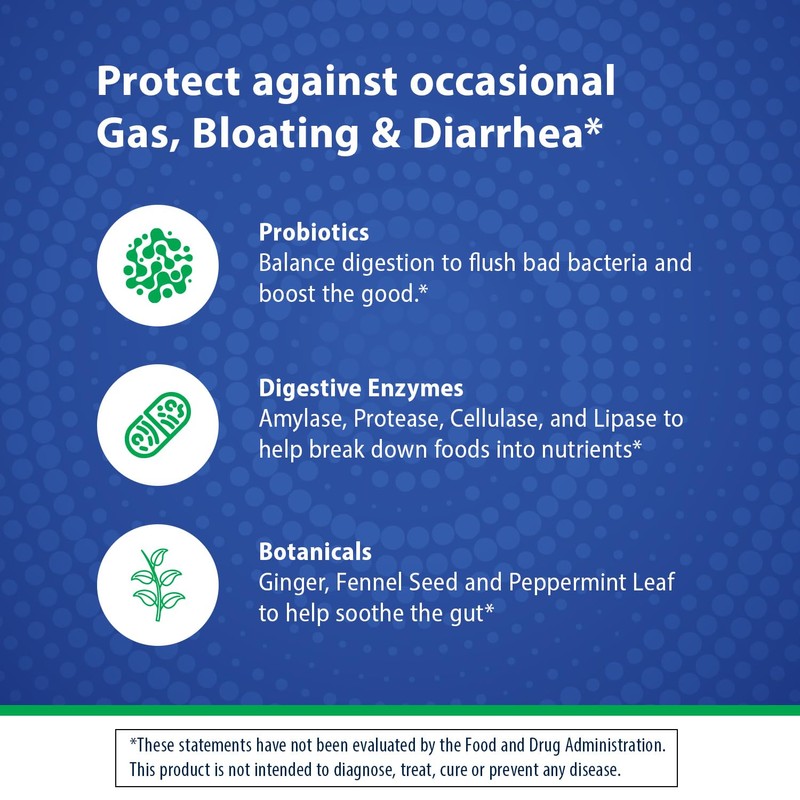 • Our proprietary blend: Florastor's Dual Action Probiotic with digestive enzymes and botanicals to help protect against occasional gas, bloating, and diarrhea; provides bloating relief for women and men.*
