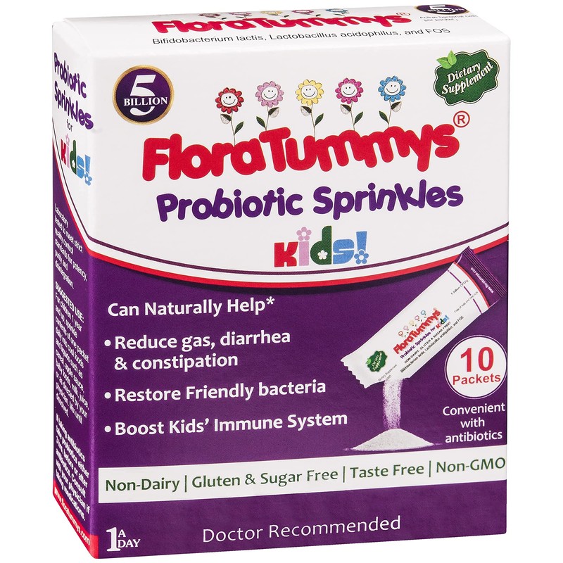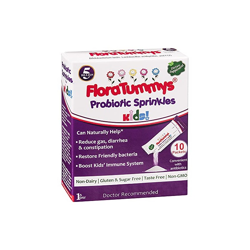 FloraTummys Probiotic Sprinkles Kids 10ct: Taste-Free, Easy-to-Use Probiotic Powder Packets, Non-Dairy, Gluten & Sugar-Free. Non-GMO, Travel Size