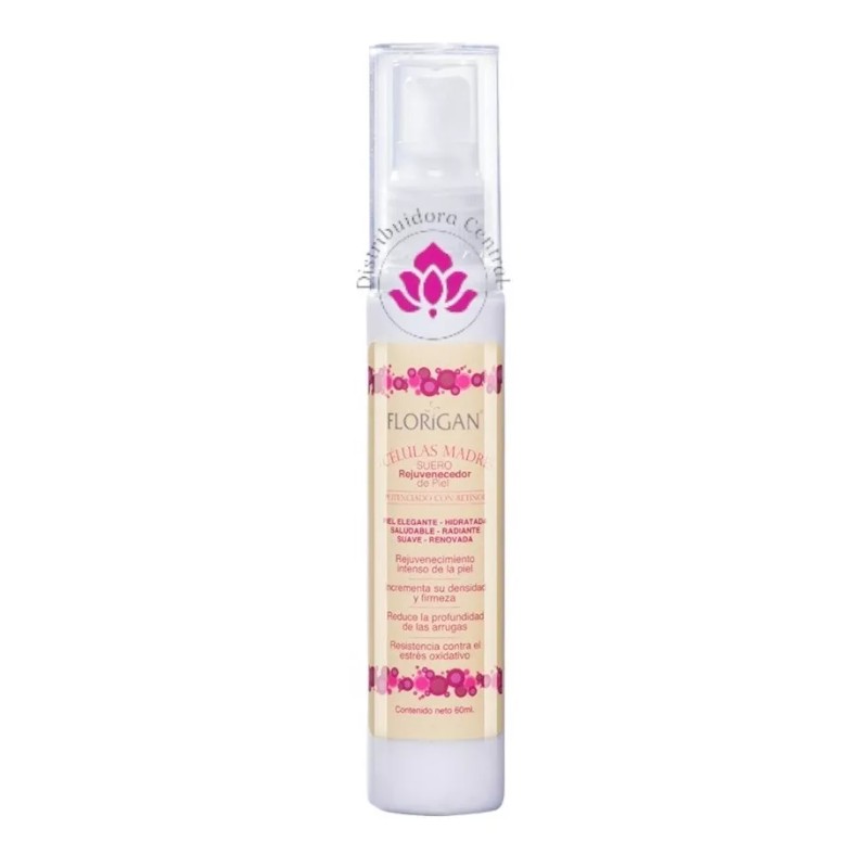 Suero Rejuvenedor Células Madre 60 ml. FLORIGAN. Suero Rejuvenedor de piel de acción efectiva. Formulado con una Original combinación de ingredientes exclusivos con base en Células Madre y potenciando con Retinol (vitamina A), ingrediente clave que actúa en la formación y mantenimiento de los tejidos diminuyendo arrugas, retrasando los efectos del envejecimiento y el ingrediente activo de generación avanzada Células Madre Vegetales, que promueve la capacidad regeneradora de las células madre de la dermis, logrando un rejuvenecimiento intenso de la piel. Ofrece alta penetración para ayudar reducir la profundidad de las arrugas. Protege y revitaliza las células madre dérmicas. Incrementa la firmeza y densidad de la piel. Acelera el proceso natural de reconstrucción cutáneo desde el fondo, combatiendo su degeneración, contribuyendo a su reconstrucción con resultados inmediatos. Esta mezcla efectiva de ingredientes activos, brinda resistencia celular contra el estres oxidativo, otorgando propiedades anti edad, nutritivas, y revitalizantes previniendo el deterioro de la dermis y epidermis. Especial para embellecer y hacer lucir la piel elegante, saludable, radiante, suave, dócil y mas joven.