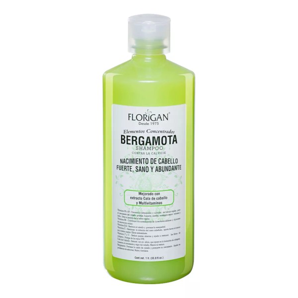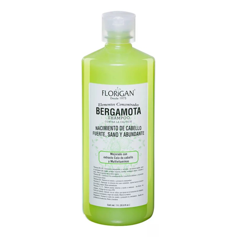 Shampoo Contra la Calvicie Elementos Concentrados Bergamota Florigan 1lt. Vitaminas B5 y B7- Favorece la estimulación y nutrición del folículo capilar para el crecimiento del cabello; protege, humecta y suaviza. Suministra mayor volumen y brillo. Evita la pérdida de la hebra capilar. Vitamina B6- Contribuye a la normalización de la secreción sebácea y al proceso de renovación celular. Vitamina B12- Restaura el cabello y previene la resequedad. Vitamina E- Disminuye la irritación del cuero cabelludo, aporta fuerza al interior de la hebra capilar. Eficaz antioxidante. Vitaminas F y C- Reduce puntas abiertas y ayuda a restaurar las fibras de colágeno. Protege de los rayos UVB. Cola de Caballo- Extracto rico en silicio que apoya en la formación de colágeno, aumenta el crecimiento y vigor del cabello. Mejora su textura. Bergamota- Previene la caída de cabello y promueve su crecimiento. Auxilia en problemas de seborrea. Nutre y fortalece. Nacimiento del cabello, fuerte, sano y abundante. Mejorado con extracto de Cola de Caballo y Multivitaminas.