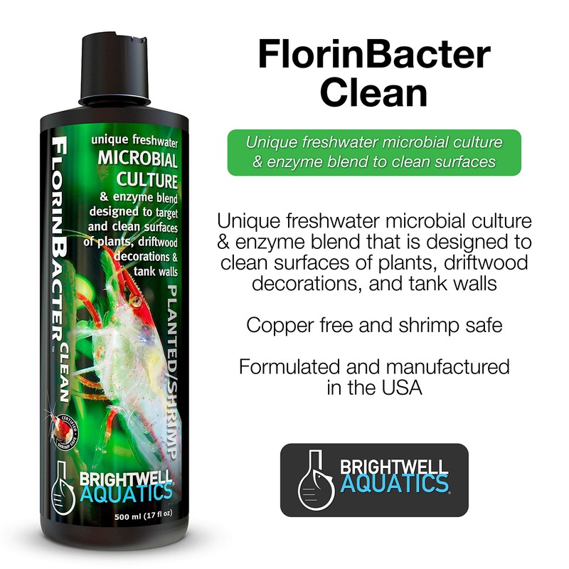 FlorinBacter Clean (Shrimp Safe), Unique Freshwater Microbial Culture & Enzyme Blend Designed to Target and Clean Surfaces of Plants, Driftwood Decorations & Tank Walls, 2 Liter