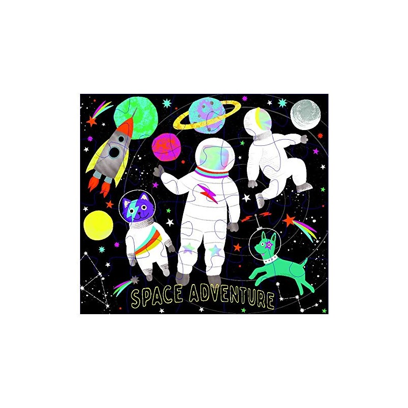 This 20 piece Floss & Rock puzzle comes in a cool astronaut shaped box with foil details. The completed puzzle measures 38 x 33cm and depicts a space scene with planets, rockets, astronauts and an astro-cat and dog! Suitable for age 3 and above.