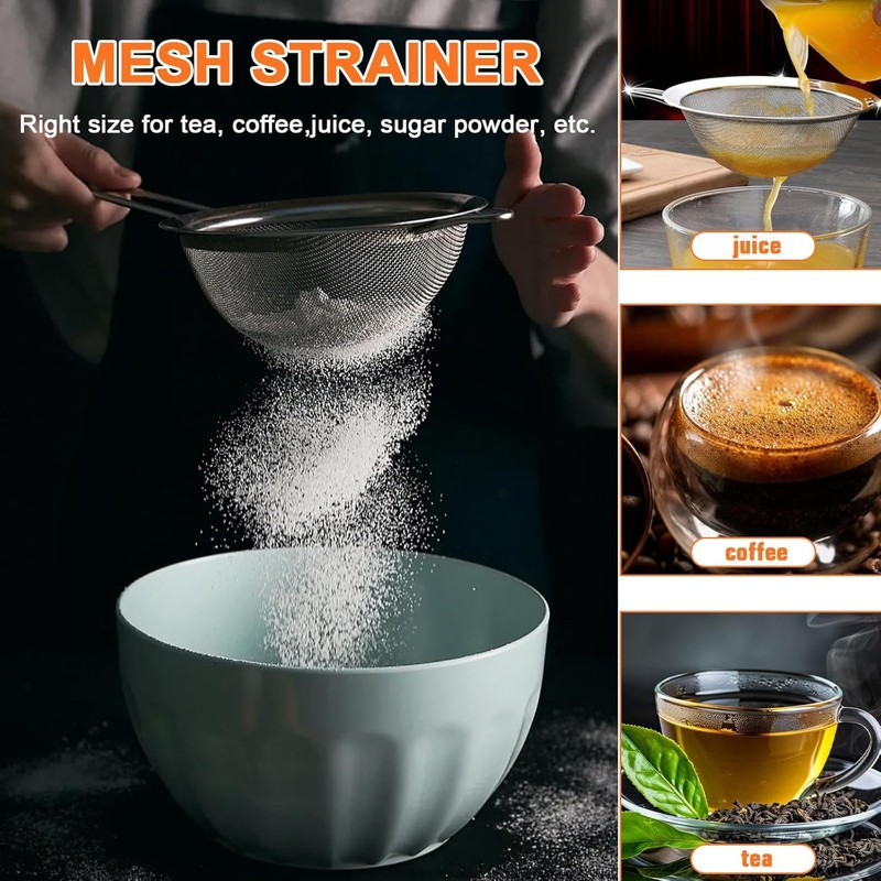- 【STRAINERS FINE MESH WITH HANDLE】 The strainers fine mesh with Handle is suitable for sugar, flour, spices, salt, pepper, corn starch and other sifting dry ingredients. For example, you can dust cocoa powder and powdered sugar on desserts or dust flour on the bread. This will help make your cake or other food more appetizing.