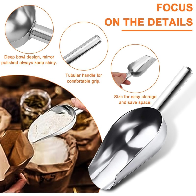 - 【PRACTICAL METAL SCOOP】 The metal scoop features a tapered design to help you scoop up flour easily. The utility scoop can not only be used to scoop flour, but it is also perfect for scooping crushed or cracked ice, candy, beans, sugar, coffee beans, rice, grains, nuts, pet food and more. It's an effective solution for holding a variety of foods!