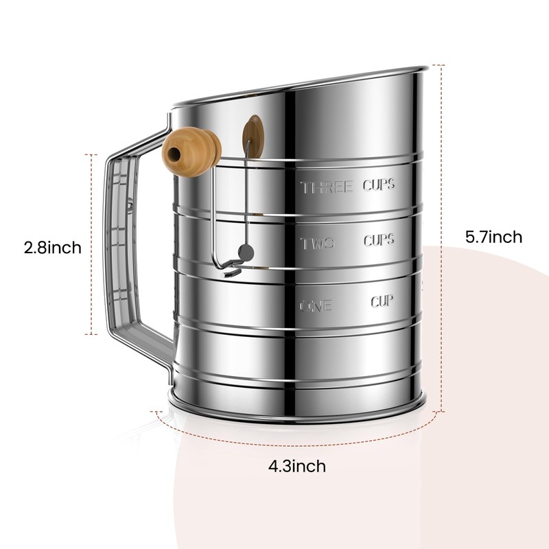 - Effortless Crank Design: This flour sifter is more comfortable than a traditional one. The hand crank reduces fatigue and offers better control for baking