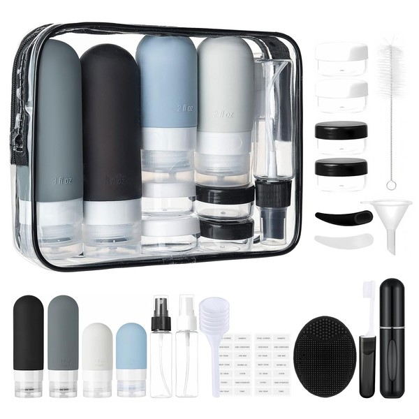 - 【Juego completo de 20 piezas】Este juego incluye 2 botellas de viaje de 90 ml, 2 botellas de viaje de 60 ml, 4 botellas de viaje de 10 g, 2 botellas de spray de 30 ml, 2 cucharas, 1 embudo, 1 cuentagotas pequeño, 1 perfume. botella, 1 cepillo de dientes plegable, 1 cepillo de masaje facial, 1 cepillo de limpieza de botellas, 1 papel de etiqueta y 1 bolsa de cosméticos transparente, que satisface todas sus necesidades de viaje.