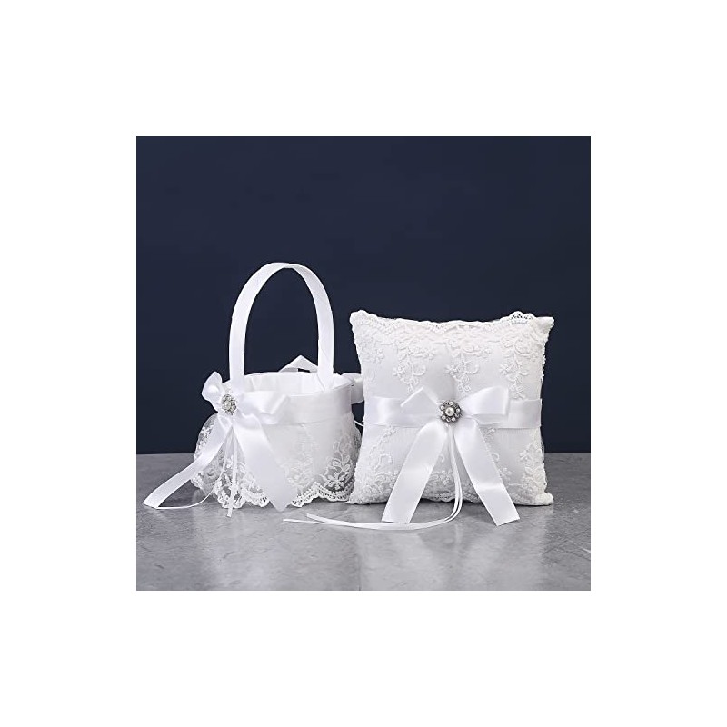 Flower Girl Basket and Ring Bearer Pillow Set Flower Girl Baskets for Weddings Ring Cushion Flower Basket White Satin Bow Pearl Wedding Party Decoration Ceremony Supplies