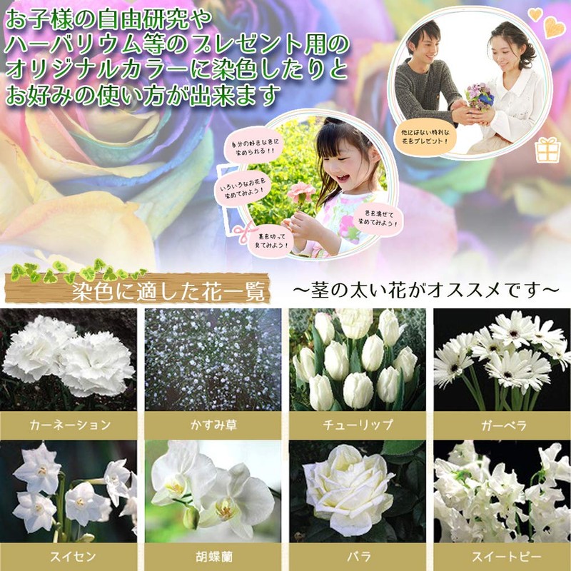 - We recommend roses and carnations. Also suitable for dyeing gypsophila, tulip, gerbera, daffodil, phalaenopsy, sweet pea, etc