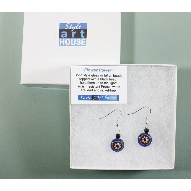 "Flower Power" Blue and Red Boho Millefiori Earrings, Dangle 1.25 Inches