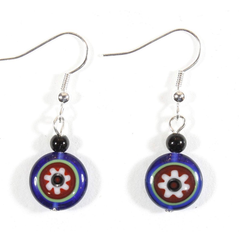 "Flower Power" Blue and Red Boho Millefiori Earrings, Dangle 1.25 Inches