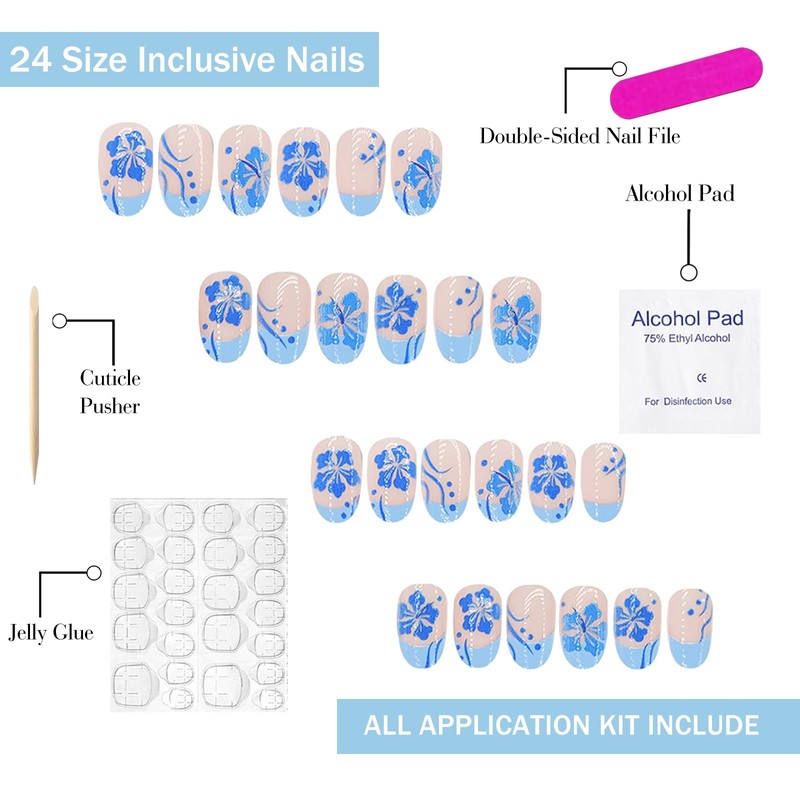 - Package Includes: 24 pieces short fake nails, 1 sheet of 24 pieces jelly glue, 1 piece of mini nail file, 1 piece of wooden stick and 1 piece alcohol pads.