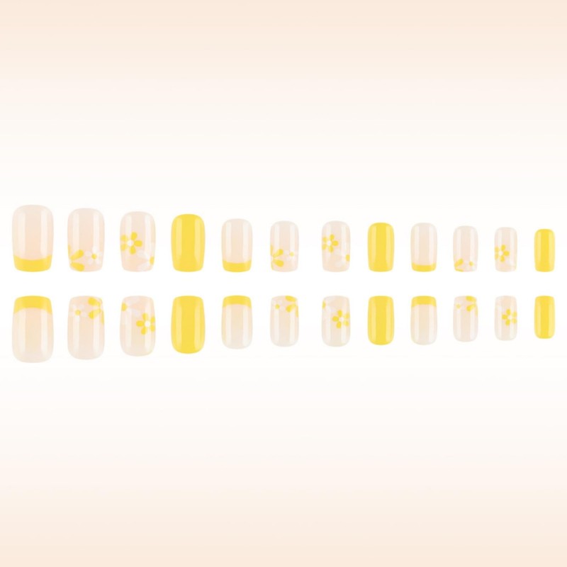 - Elegant French Tip Floral Design – These short square press on nails feature a classic French tip with delicate floral accents, offering a timeless and feminine look perfect for any occasion. The full-cover design ensures a natural, polished finish.