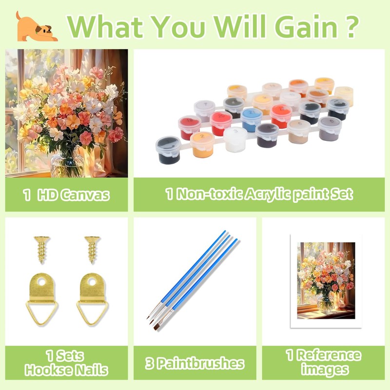 The kit includes one pre-printed canvas and instructions, one set of brushes, a set of acrylic paints, and wall hangings to showcase your completed work. The canvas is marked with numbers that correspond to the colors of paint that should be applied in those areas, making the painting process straightforward and convenient.