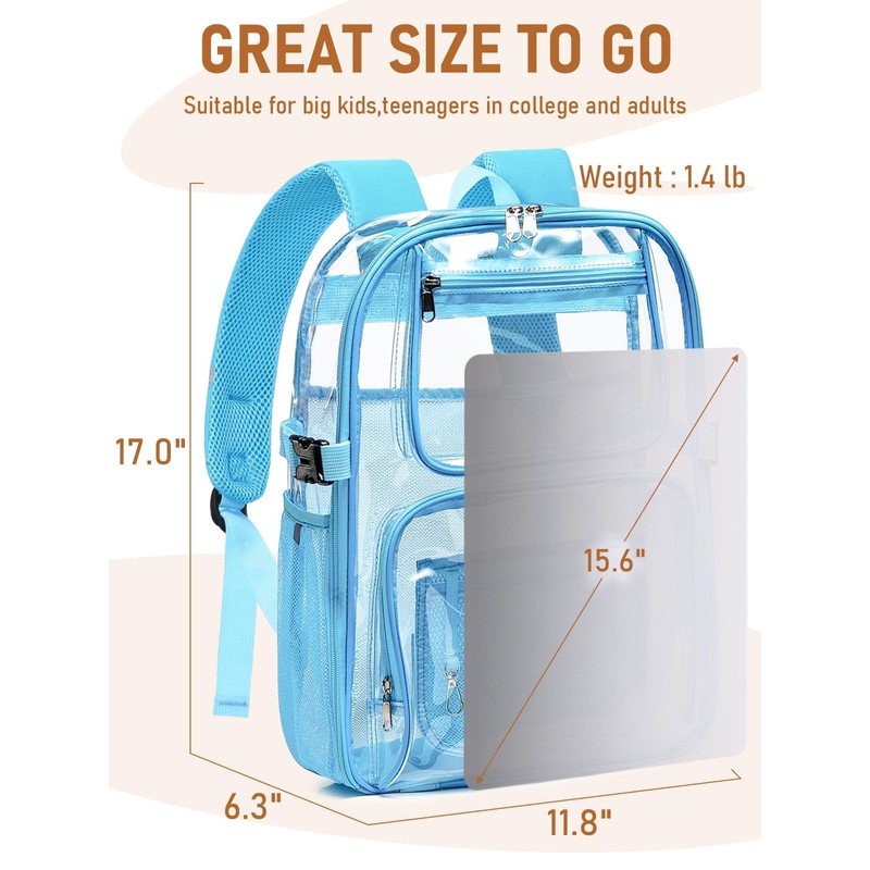 - Multipurpose Large Clear Backpack: This plastic backpack suitable for school, college, workplaces, travel, concerts, airports, sports, festivals, concerts and many various occasions. The see-through design is convenient for safety inspection, which can quickly pass through checkpoints and save time. Clear school backpack perfect choice for women, men, girls, boys, kids who are over 6 years old. Ideal Gifts for above 6 years old on Back-to-school day, Christmas, Thanksgiving, Birthdays