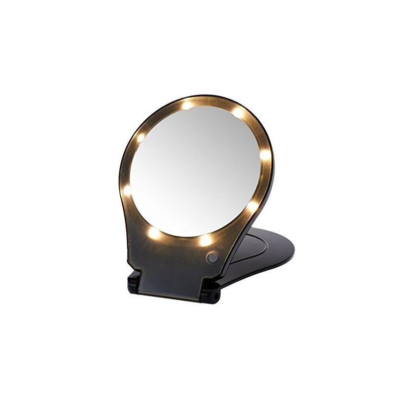 See yourself in a whole new light--no matter where you go. This 5X magnification mirror is built with distortion-free DFP glass for a clear view, plus bright LED bulbs that go 360 degrees around the mirror for brilliant illumination! The included cover conveniently transforms into a stand, and the entire mirror folds down to just 1" for easy portability. From Floxite.