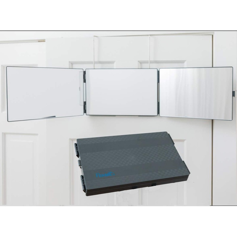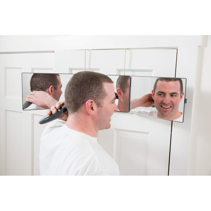 Hinges have been updated and strengthened. Mirrors are coated in plastic - must be removed before use. Mirror hangs from any door, adjustable to heights from 5' to 6/4. Hang mirror from top of door, pull down to height, telescoping hooks are designed to hold when pulled down. Sides adjust to any angle for perfect viewing of the back of head. Folds flat for easy storage and travel.