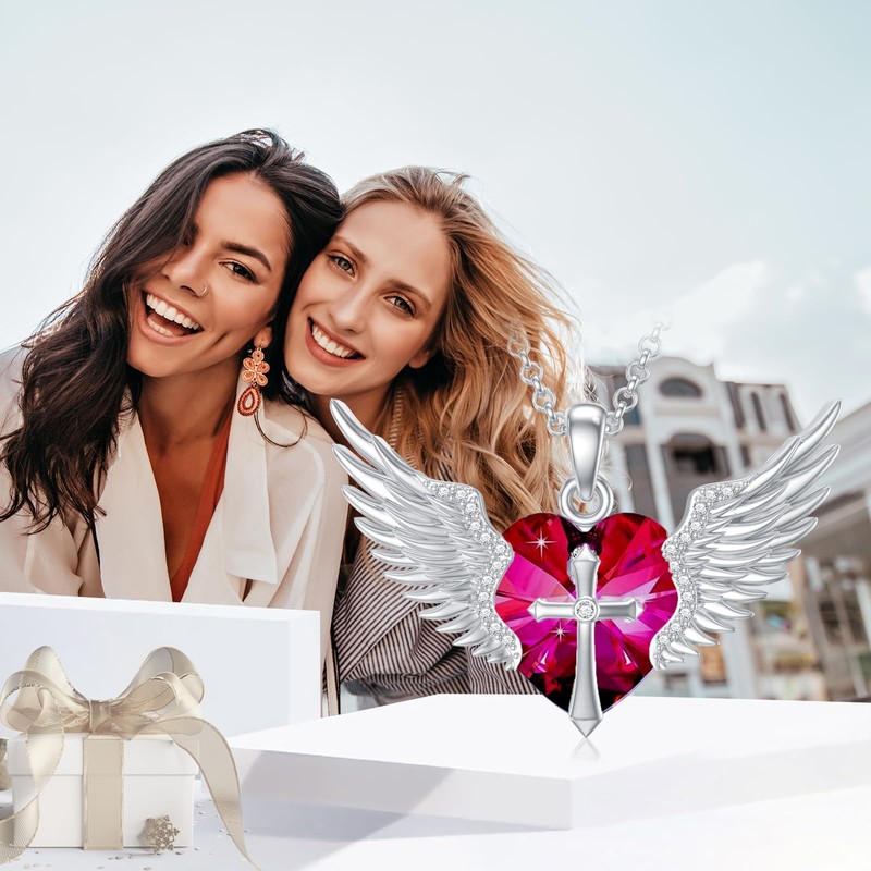Flpruy Angel Wings Necklace with Cross Sterling Silver Guardian Angel Wings Pendant with Birthstone Necklace Valentine's Day Anniversary Birthday Angel Jewelry Gifts for Women Girl, Sterling Silver,