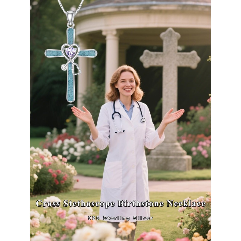 Flpruy Stethoscope Cross Necklace with June Light Violet Heart Birthstone 925 Sterling Silver Turquoise Doctor Nurse Pendant RN Registered Graduation Nurse Jewelry Gifts for Women