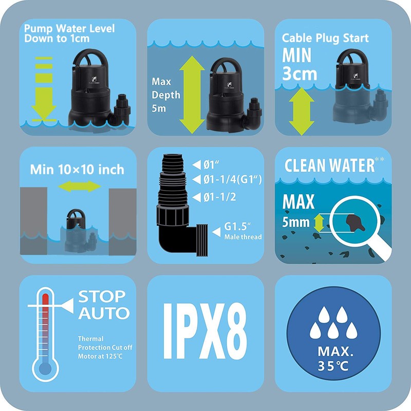 - ✅【1/3 HP Power High Efficiency】1/3 HP, portable and energy saving, with multiple discharge hose fittings, including NPT1" and GHT 3/4" male thread for Standard Garden Hose, easy to set up