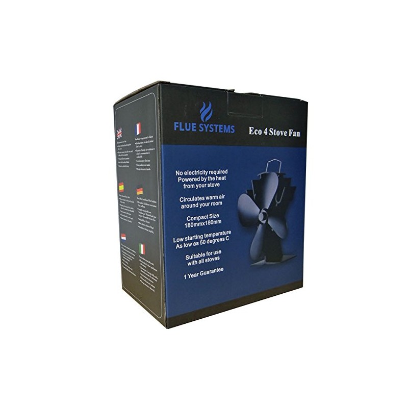 The Eco 4 stove fan from Fluesystems is a 4 blade heat powered stove fan designed to circulate the air from a wood or gas stove. The Eco 4 stove fan has a thermo-electric module that acts as a small generator to the fan motor power.
