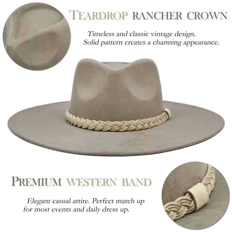 FLUFFY SENSE. Big Wide Brim Felt Rancher Fedora Hat for Women and Men - Boho Western Hat with 4 inches Flat Brim (US, Alpha, Medium, Stone Gray)