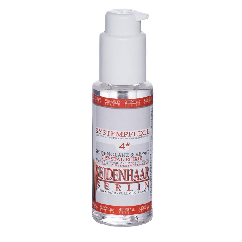 System care 4 *: silk shine & repair/crystal elixir serum instantly provides shine, care, protection and unsurpassed suppleness smooths the hair structure, without weighing down and greasing is absorbed by the hair, leaves no sticky film on the hair, protects against split ends and drying out with daily use, e.g. by hair drying, the extremely economical + perfect care. supplesupplesupplementfor extensions and long hair with a pleasant fragrance, which accompanies you throughout the day with 1-2 drops a day, distribute the beauty of your extensions evenly in the hair with your hands and then brush on dry and damp hair for perfect combability. Tip: after shampooing evenly applied to the hair, it gives your hair extra shine and optimal combability in seconds, smooths the hair without 1