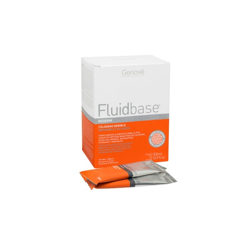 El producto Fluidbase Rederm Colágeno Bebible 500 ml (20 sobres) es un complemento alimenticio diseñado para combatir los signos del envejecimiento cutáneo desde el interior. Su formulación incluye péptidos bioactivos de colágeno, ácido hialurónico, astaxantina, vitaminas y minerales, que trabajan en conjunto para mejorar la salud de la piel.
